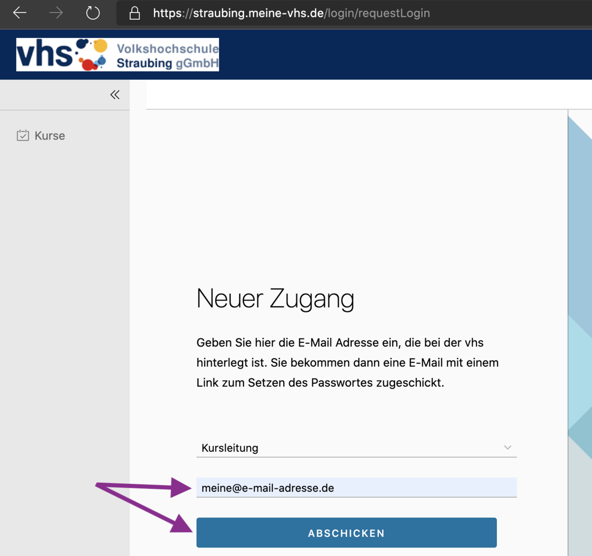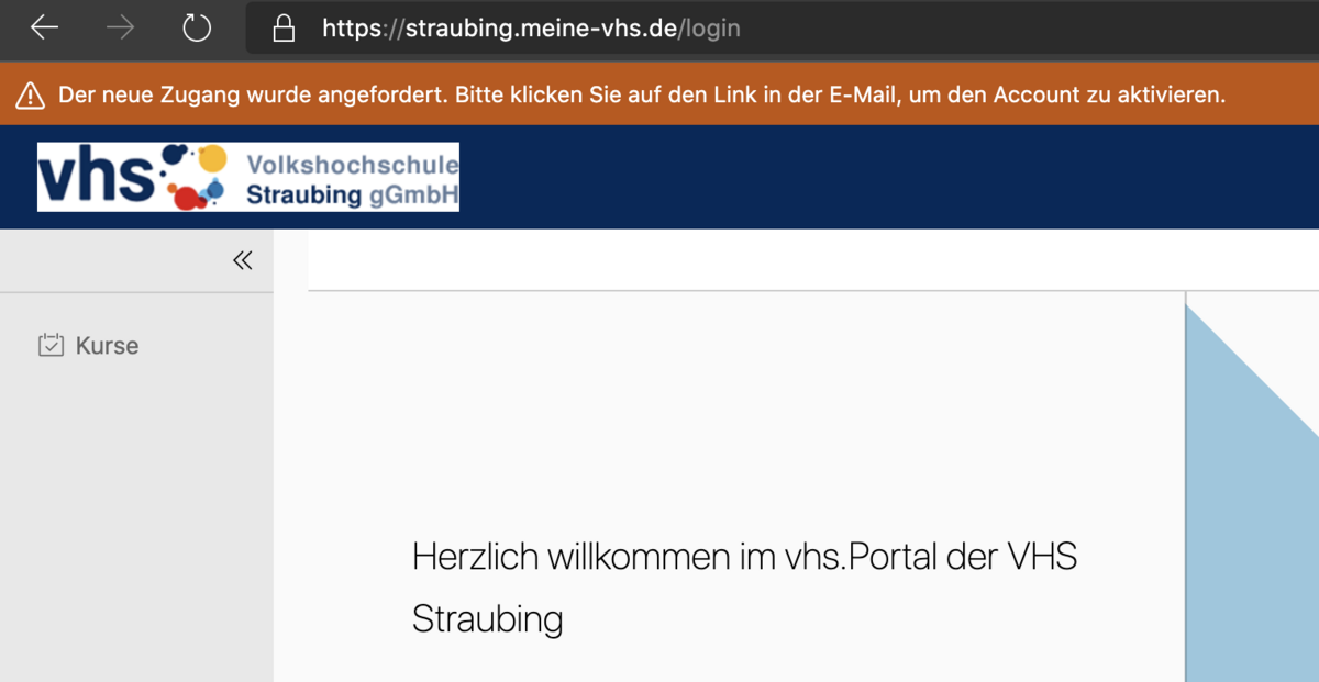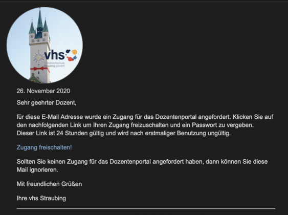 - klären Sie mit dem Team der vhs Straubing, welche E-Mail-Adresse im Verwaltungsprogramm hinterlegt ist