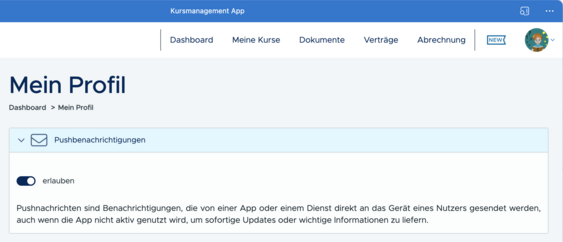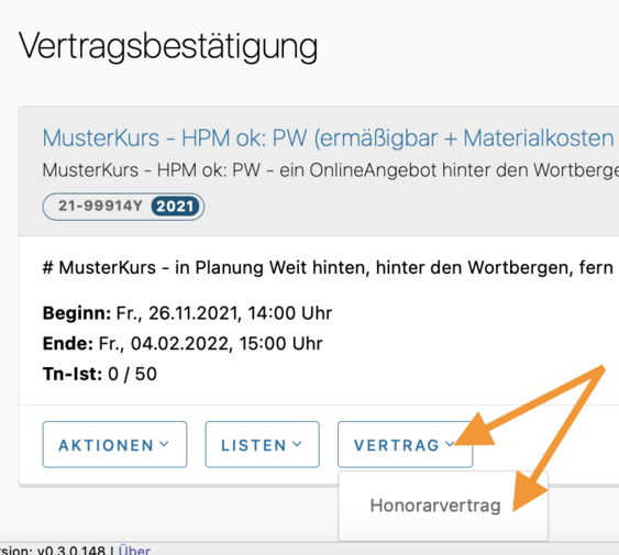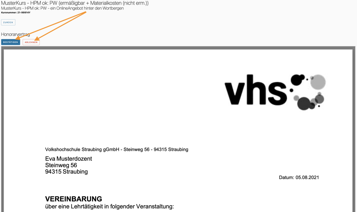 Bei einem Kurs in der Rubrik "Vertragsbestätigung" können Sie den Vertrag einsehen und dann auf Wunsch auch gleich "virtuell" unterschreiben: