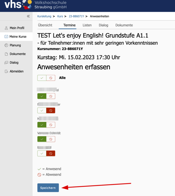 Wenn alle Anwesenheiten für den Tag richtig gesetzt sind, klicken Sie auf "Speichern".