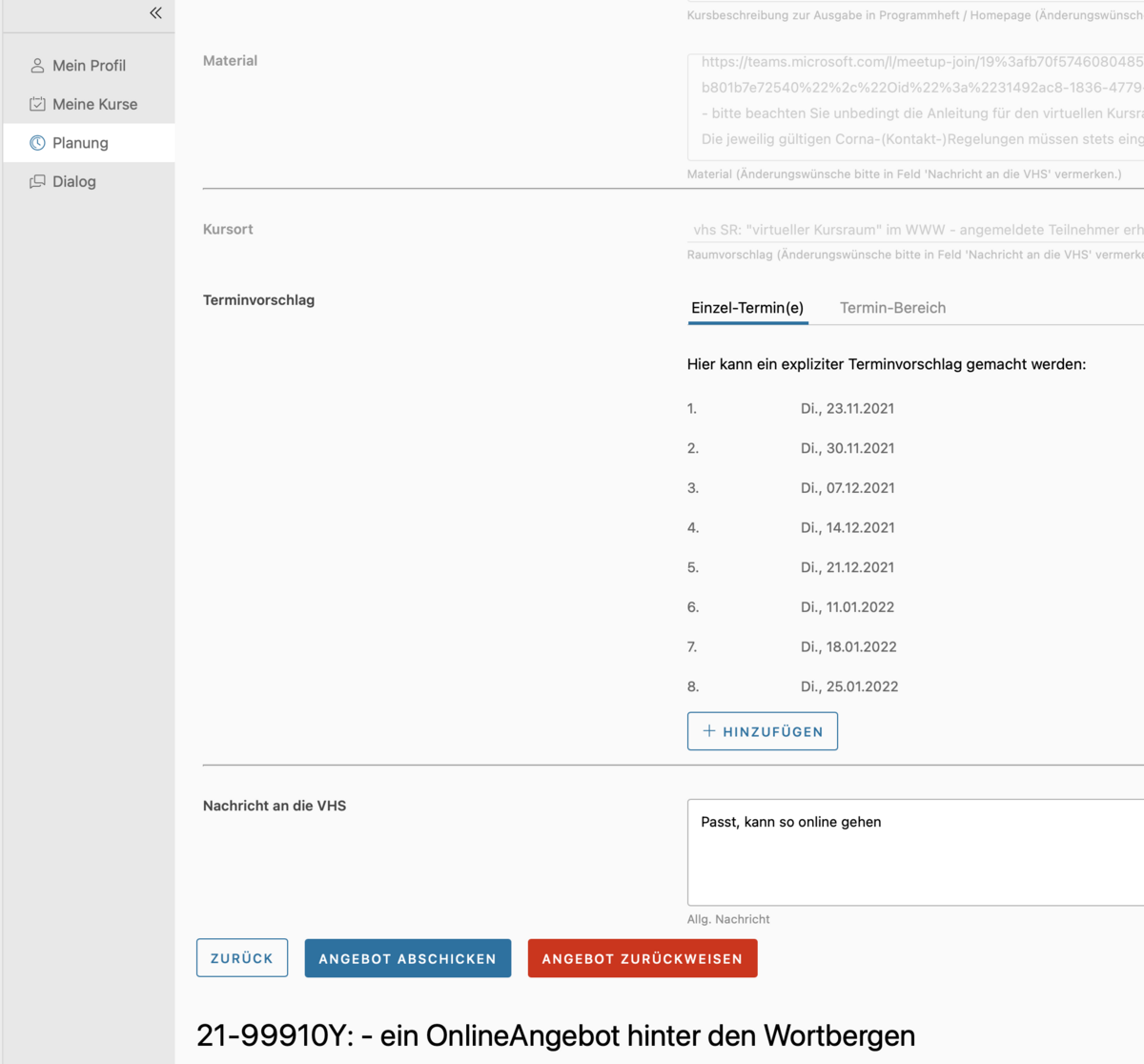 Bei einem Kurs im Bereich "Angebotsplanung" können Sie mit einem Klick auf "Bearbeiten" alle Inhalte und Termine des Kurses sehen, wie Sie von der vhs im Verwaltungsprogramm eingetragen wurden.