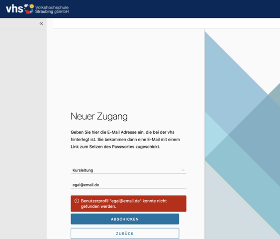 Wenn die eingegebene E-Mail-Adresse bei uns in Ihrem Datensatz hinterlegt ist, wird der neue Zugang/Account angelegt und der Zugang vorbereitet.
