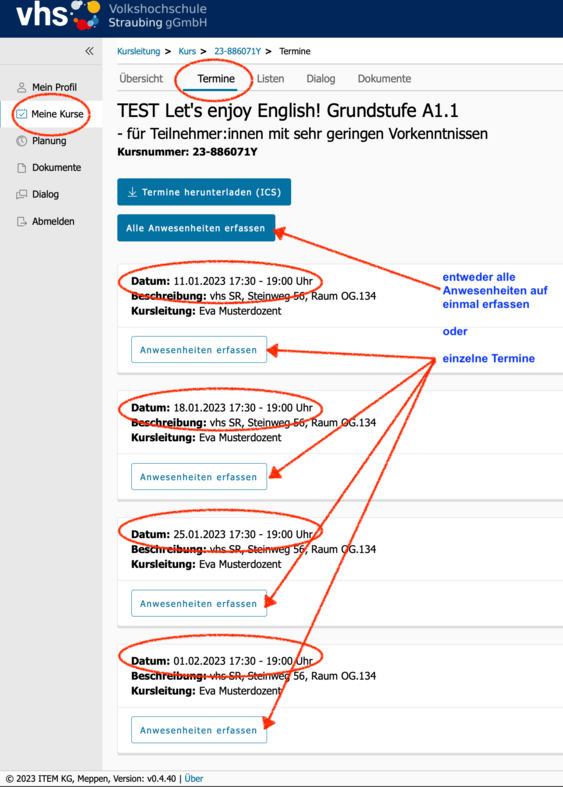 Bei jedem Ihrer Kurs sehen Sie im Reiter "Termine" alle Kurstage dieses Kurses - für alle Kurstage bis heute kann der Button "Anwesenheiten erfassen" geklickt werden: