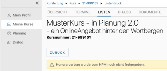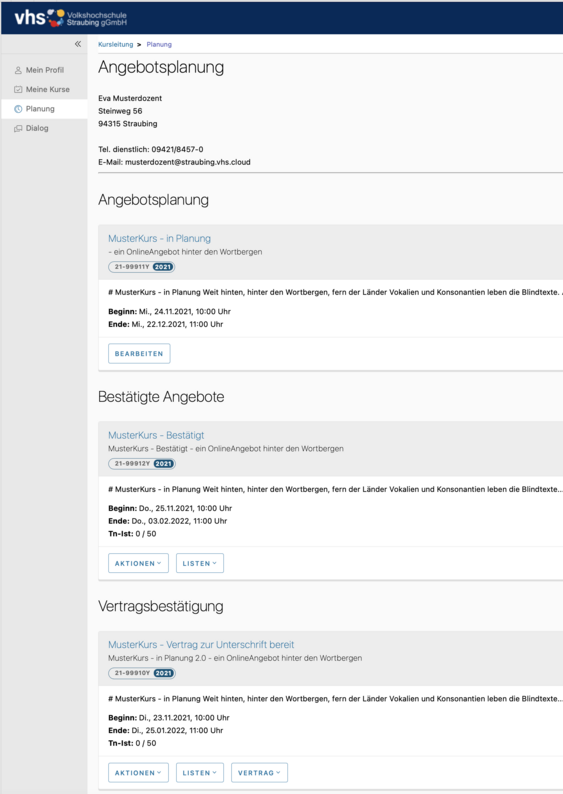 Der Kurs wird dann zunächst in der Rubrik "Bestätigte Angebote" geführt, bis von der Fachbereichsleitung der Vertrag freigegeben (virtuell unterschrieben) wird - Sie erhalten ein Mail, sobald der Vertrag "unterschriftsreif" vorliegt!