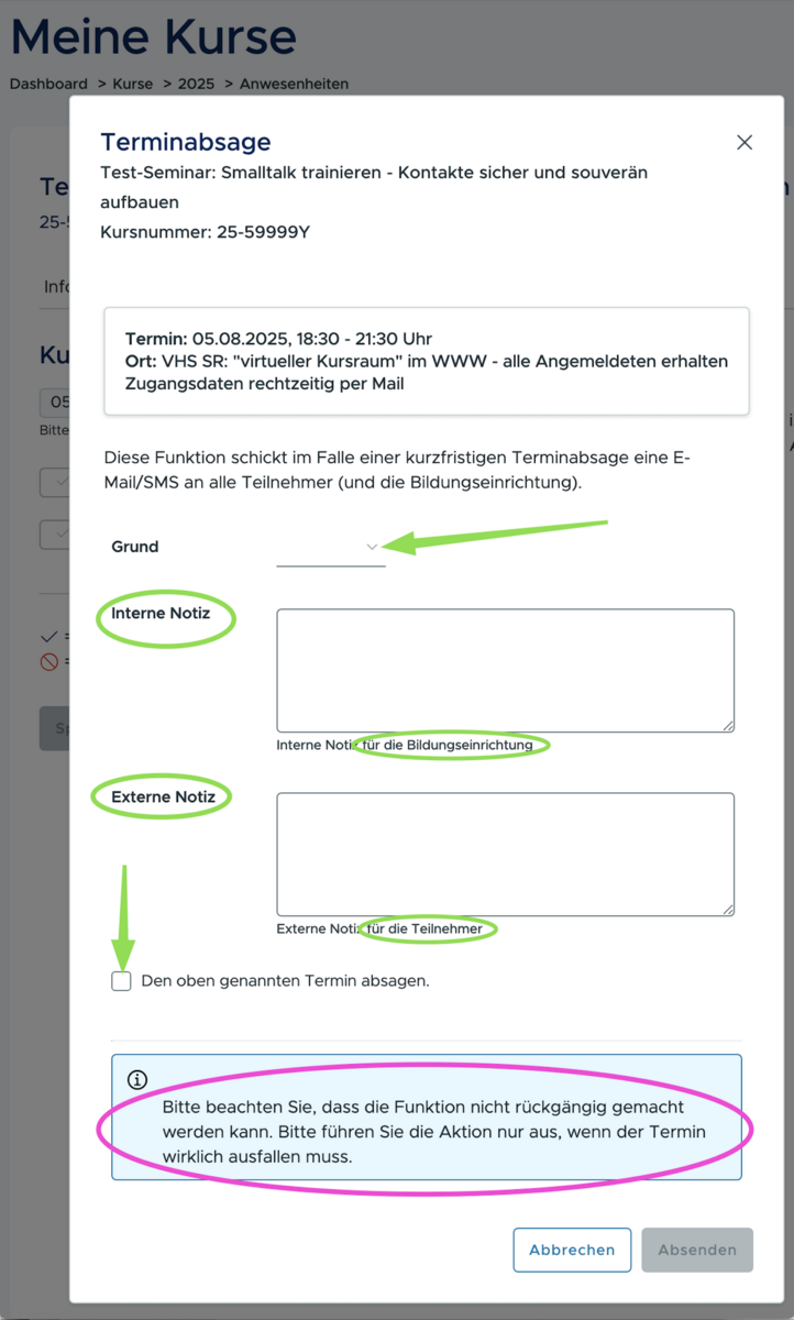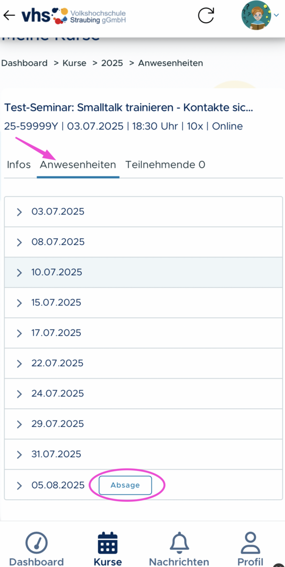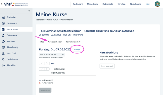 Der Button „Absage“ ist ab sechs Stunden vor Beginn eines Kurstages aktiv.