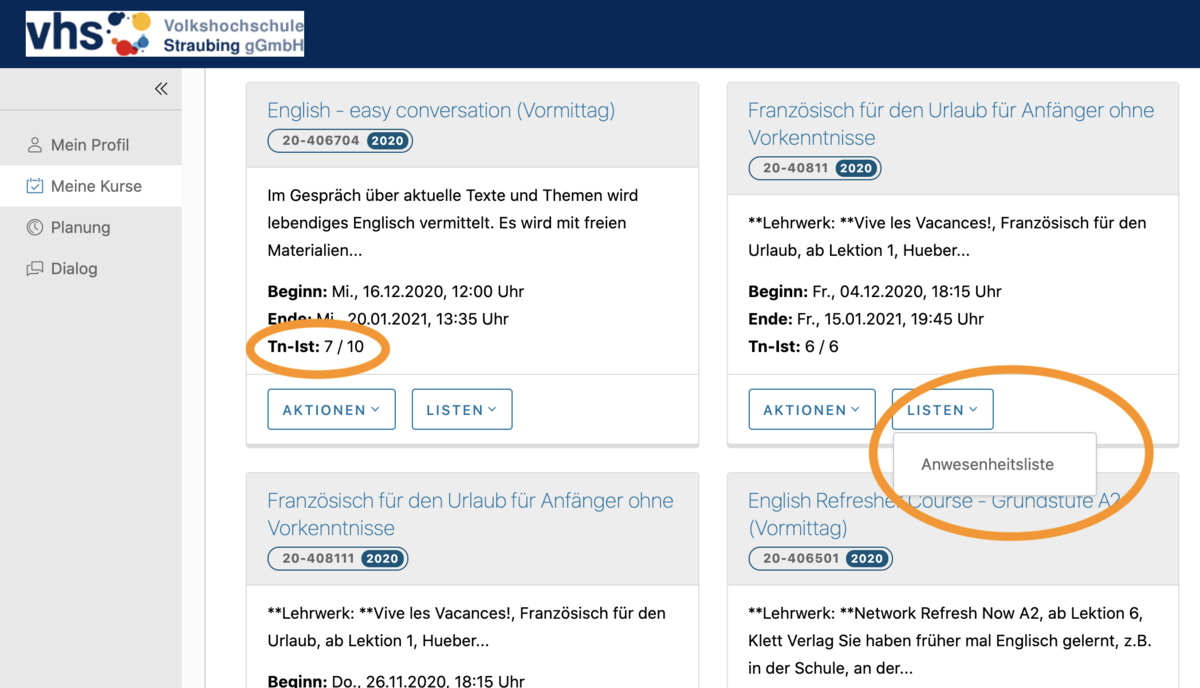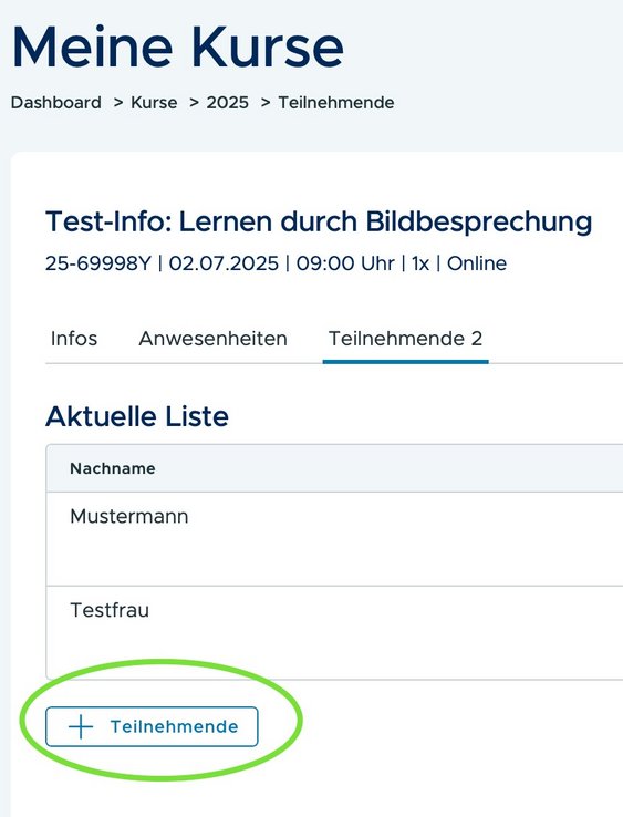 Wichtig: Die Anzeige der Teilnehmer steht Ihnen erst zur Verfügung, wenn der Kurs die Mindestteilnehmerzahl erreicht hat.