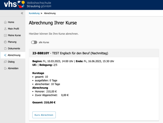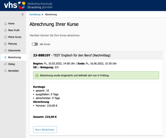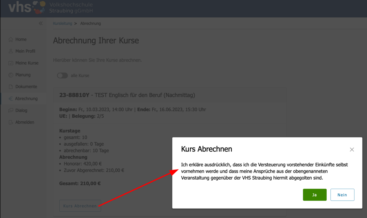 Wenn Sie nun auf "Kurs Abrechnen" und dann auf "Ja" klicken, unterschreiben Sie virtuell Ihre Honorar-Abrechnung an uns.
