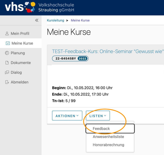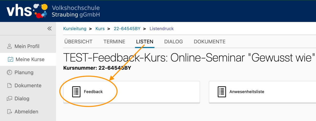 Um das abgegebene Feedback Ihrer Teilnehmer:innen zu einem Kurs zu sehen, müssen Sie zu den "Listen" des gewünschten Kurses - entweder gleich hier in der Übersicht der akuellen Kurse unter "Meine Kurse":