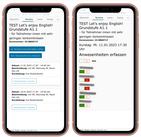 Auch auf einem mobilen Gerät ist das Dozentenportal gut zu bedienen - Sie können also die Anwesenheit durchaus auch direkt im Kurs erfassen: