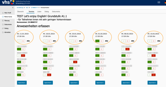 Wenn (fast) alle anwesend sind/waren, können Sie oben bei "Alle" auf den grünen Haken klicken - dann wir bei allen angemeldeten Teilnehmer:innen des Kurses dieser Kurstag auf "anwesend" gesetzt.