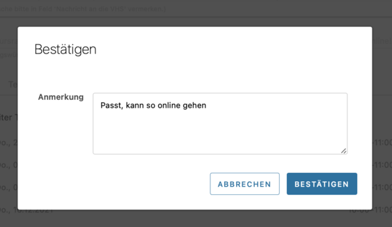 Mit einem Klick auf "Angebot abschicken" können Sie der vhs-Verwaltung mitteilen, dass der Kurs richtig erfasst ist (ggf. können Sie unter "Anmerkung" noch etwas eintragen) - sobald Sie auf "Bestätigen" gedrückt haben, wird dies an die vhs übermittelt.