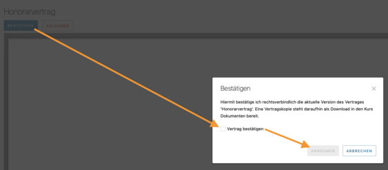 Wenn Sie den Vertrag so annehmen wollen, dann können Sie oberhalb des angezeigten Vertragstextes auf "Bestätigen" klicken - mit "Zurück" können Sie den Vorgang abbrechen - mit "Ablehnen" wird der Vertrag abgelehnt und kann nicht mehr angenommen/bestätigt werden!