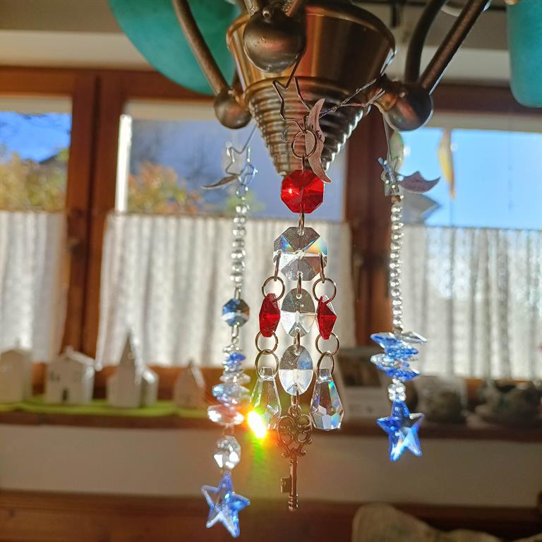 Unter einen Strahler, ins Sonnen-Fenster oder auf die Terrasse gehängt, funkeln sie und werfen bei Bewegung regenbogenfarbige Glanzlichter durch jeden Raum.