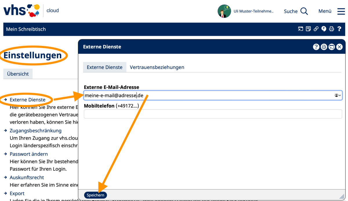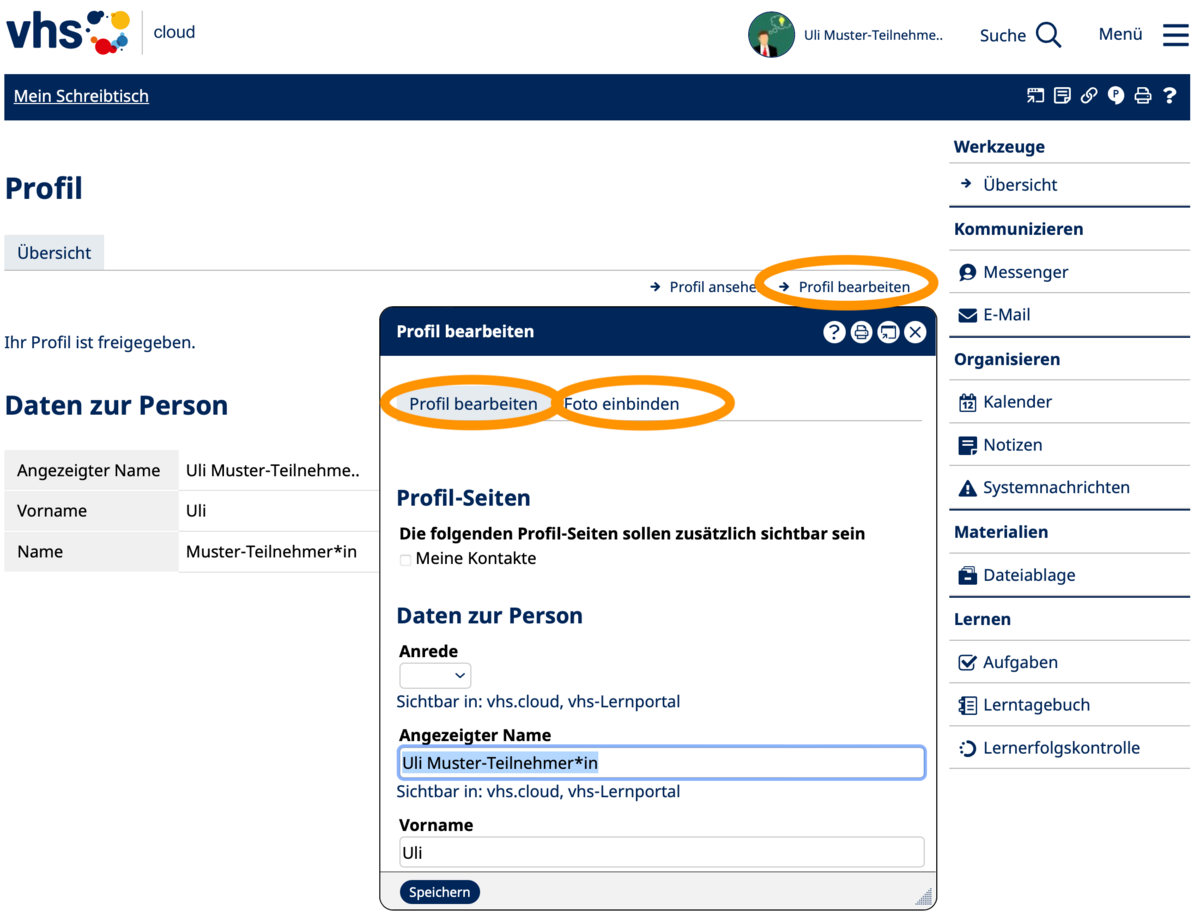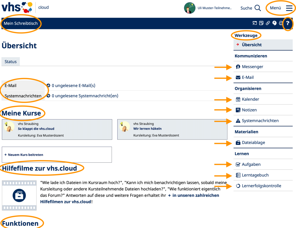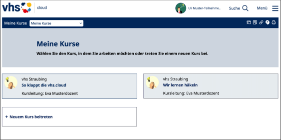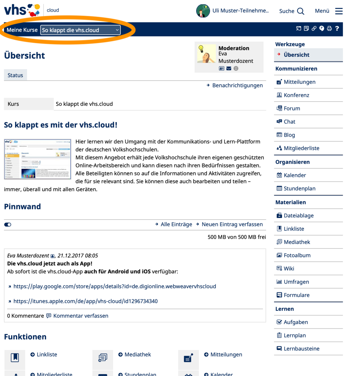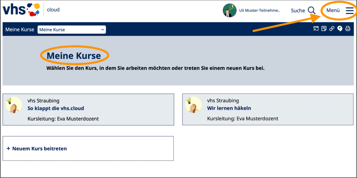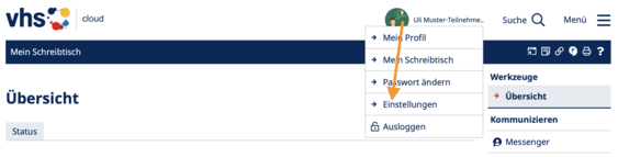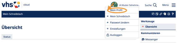 Falls Sie weitere Funktionen/Bereiche in der vhs.cloud suchen, so nutzen Sie bitte das Menü rechs oben: