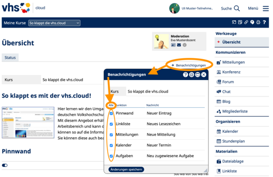 Auch im Kurs müssen die Benachrichtigungen erst noch eingeschaltet werden, damit nichts verpasst wird - das geht über den Menüpunkt „Benachrichtigungen“ rechts unter dem Moderator auf der Startseite des Kurses.