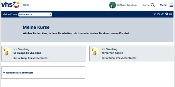 Falls Sie nur in einem Kurs eingeschrieben sind, "landen" Sie gleich dort - ansonsten können Sie hier schnell in Ihre Kurse wechseln oder einem neuen Kurs beitreten, falls Ihnen ein Kurscode (sieht aus wie eine E-Mail-Adresse) vorliegt