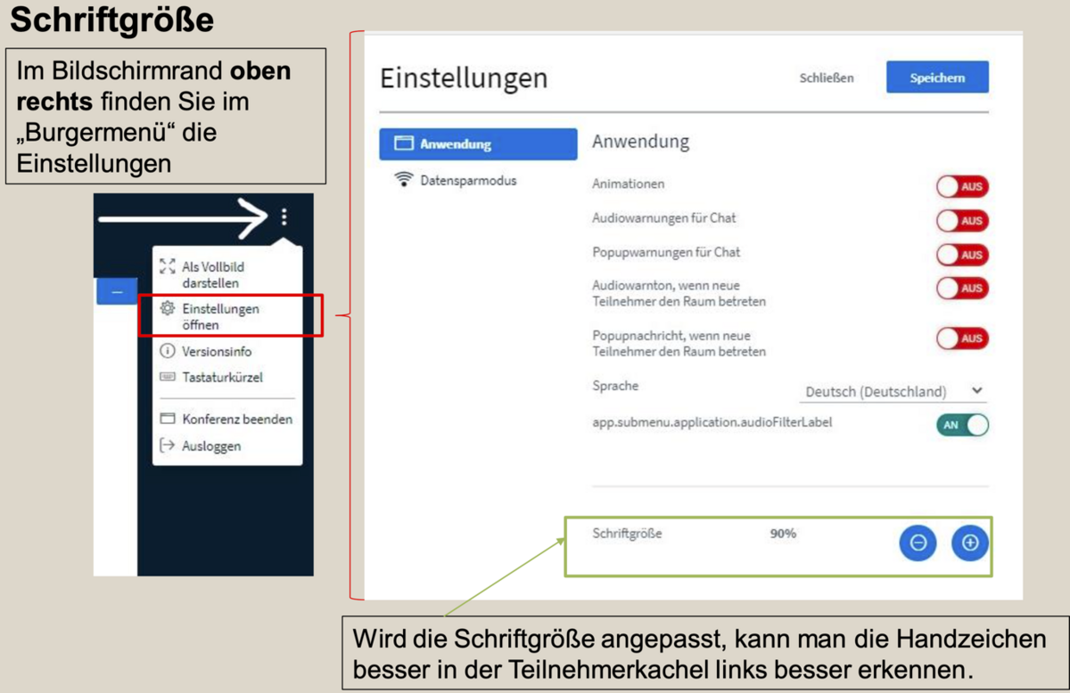 Wird die Schriftgröße angepasst, kann man die Handzeichen in der TN-Kachel links besser erkennen!