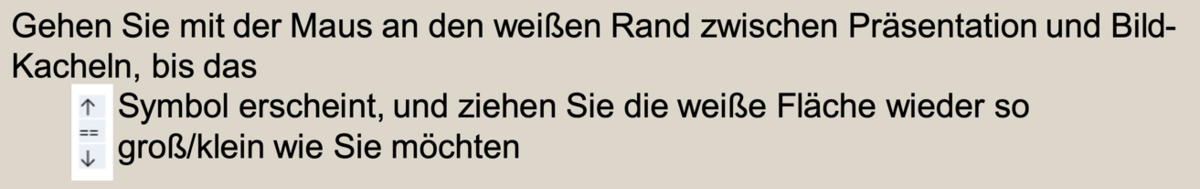 Sollte die Präsentationsfläche durch die TN-Kacheln zu klein geworden sein, haben Sie die Möglichkeit, die Präsentationsfläche wieder groß/klein zu ziehen. Gehen Sie mit der Maus an den weißen Rand zwischen Präsentation und Bild-Kacheln, bis das entsprechende Symbol erscheint, und ziehen Sie die weiße Fläche wieder so groß/klein wie Sie möchten: