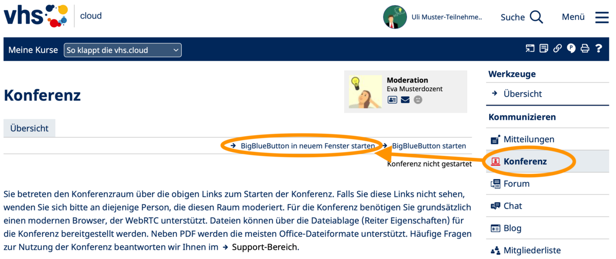 - Klicken Sie nun auf die Funktion „Konferenz“ und dort auf den Link "BigBlueButton in neuem Fenster starten" rechts oben